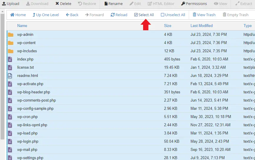 از بالای صفحه روی دکمه “Select All” کلیک کنید تا همه فایلها و پوشهها انتخاب شوند.